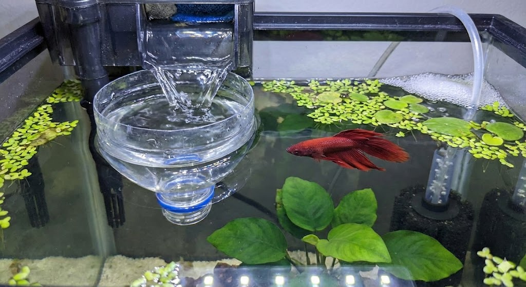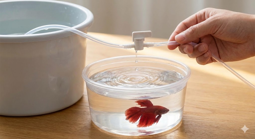 これは、エアチューブを使って1秒に1〜2滴ずつ新しい水を点滴のように落としていく方法で、時間をかけてゆっくりと水質を馴染ませることができます。これにより、ベタの粘膜やエラへのダメージを最小限に抑えることができます。