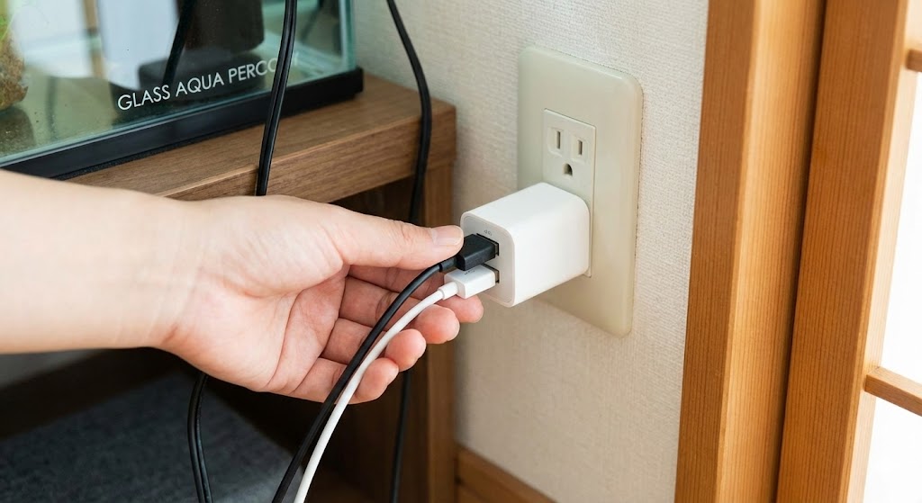 さらに厄介なことに、ポンプ用の電源ケーブルと、LEDライト用の電源ケーブルがそれぞれ独立しています。つまり、この水槽を完全に稼働させるためには、合計で2ポート分のUSB電源が必要になります。「家に余っているスマホの充電器を使えばいいや」と思っていると、ポートが1つしかなくてライトかポンプのどちらかしか動かせない、という事態になります。