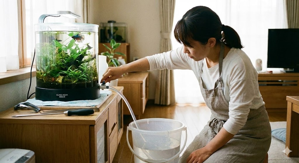 流量が1.6L/分と非常に弱いため、水槽の四隅や底床付近に「止水域(水が動かない場所)」ができやすく、そこに汚れが溜まりやすい傾向があります。強力なろ過フィルターで水を循環させてピカピカに保つというよりは、「こまめな水換えで物理的に汚れを排出する」という運用スタイルが求められます。「ろ過フィルターがついているから水換えは月1回でいい」といった考え方は、この水槽では通用しません。