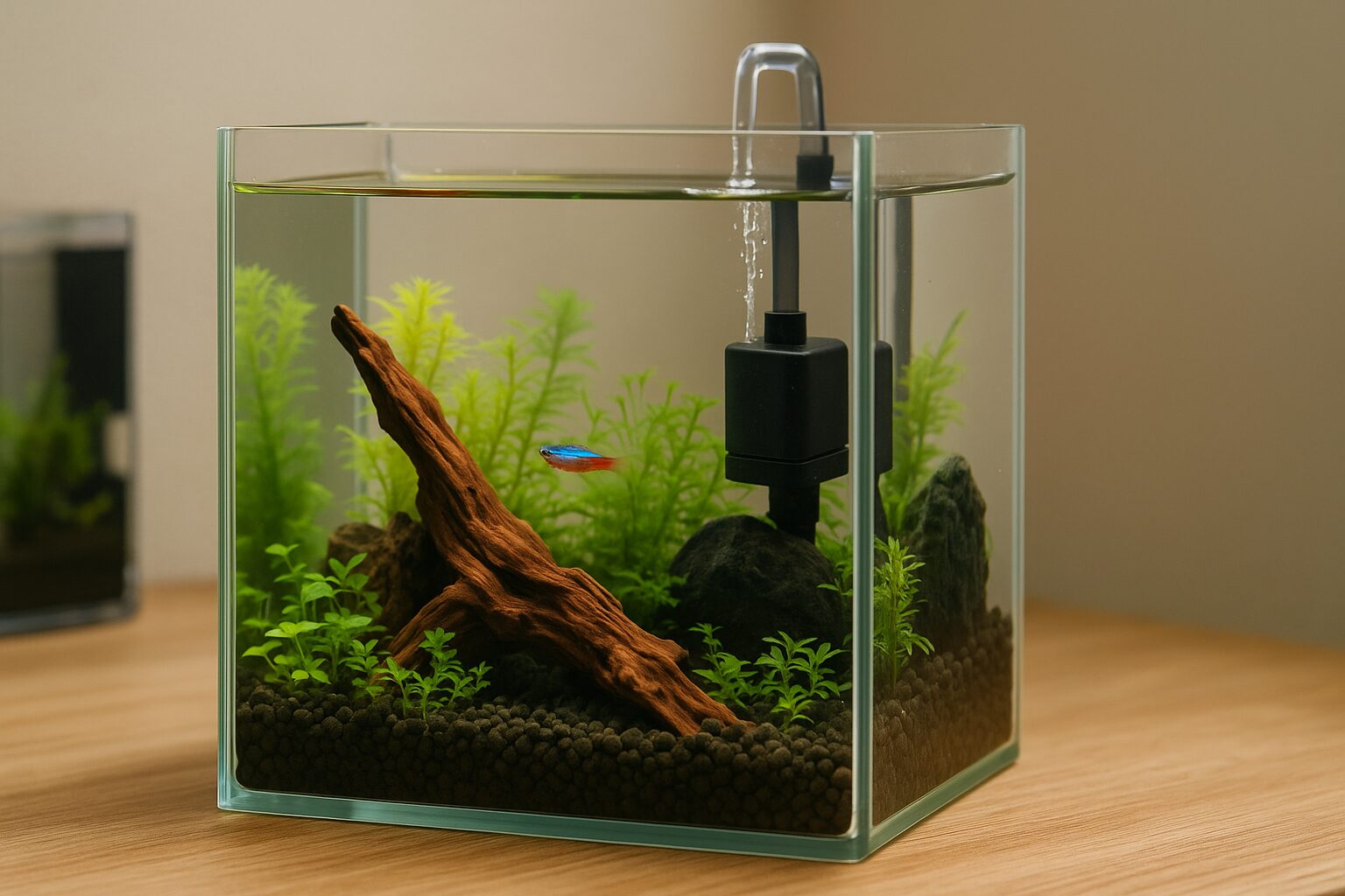 限られたスペースで楽しむ小型水槽やボトルアクアリウム。その美しい世界観を維持しようとする時、最大の敵となるのが「フィルターの存在感」と「動作音」です。「せっかく綺麗なレイアウトを作ったのに、黒い箱が目立って台無し…」「寝室に置いたらブーンという音が気になって眠れない…」そんな悩みを抱えているアクアリストは少なくありません。