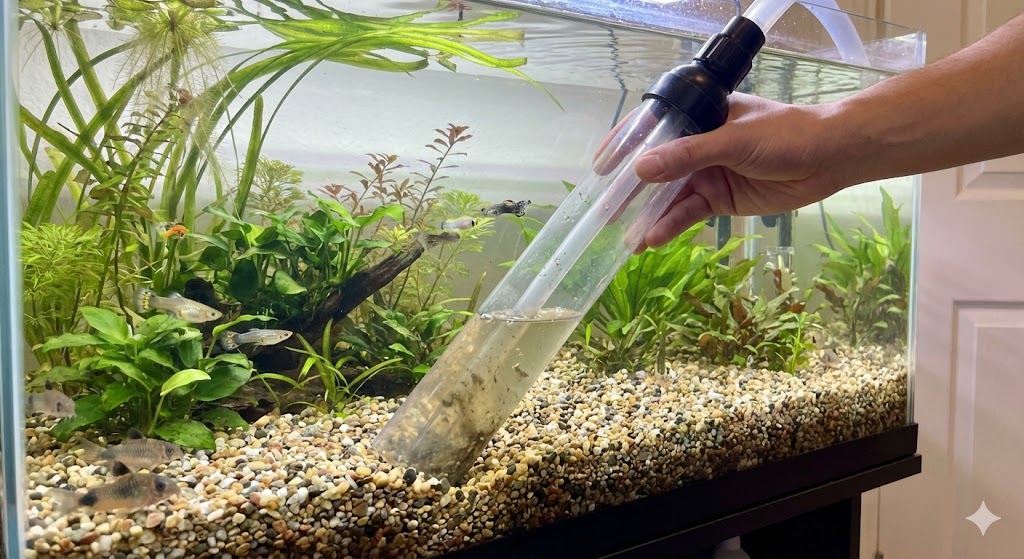 大磯砂や田砂を使用する場合、週に一度の水換えとセットで行う「底砂掃除」が、水槽の運命を左右すると言っても過言ではありません。砂の粒と粒の隙間には、魚のフンや食べ残しが分解された微細な汚れ(デトリタス)が蓄積していきます。これを放置すると、エロモナス菌などの病原菌の温床となり、グッピーが病気になる原因となります。