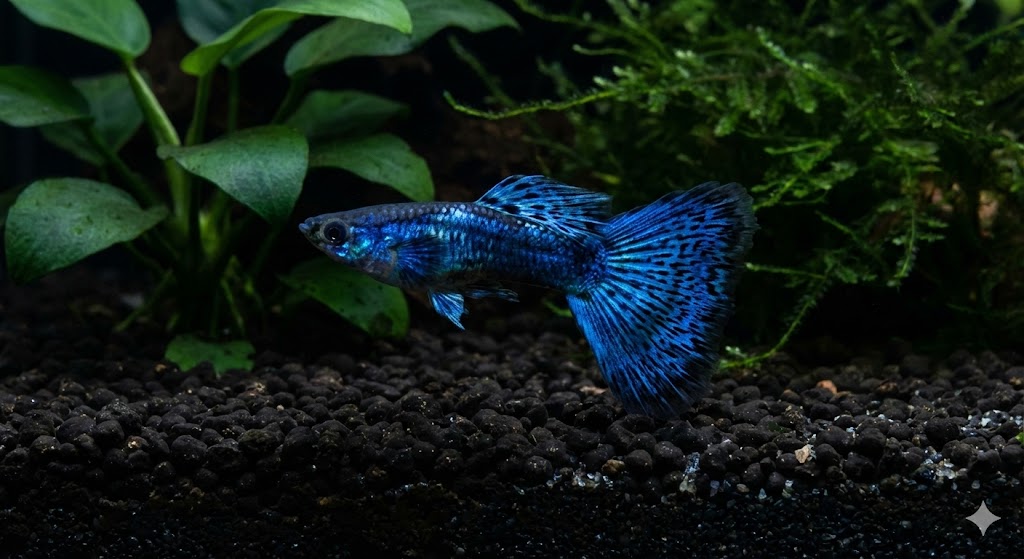 背景が黒っぽい場合、グッピーは周囲に馴染もうとして色素胞を拡散させます。その結果、体色が濃く、深く、鮮やかに発色します。特に「ブルーグラス」や「フルブラック」、「モスコブルー」といった青〜黒系の品種や、赤色の濃さを強調したい場合には、暗い色の底砂が必須です。魚の輪郭がくっきりと浮かび上がり、重厚感のある美しさを楽しむことができます。