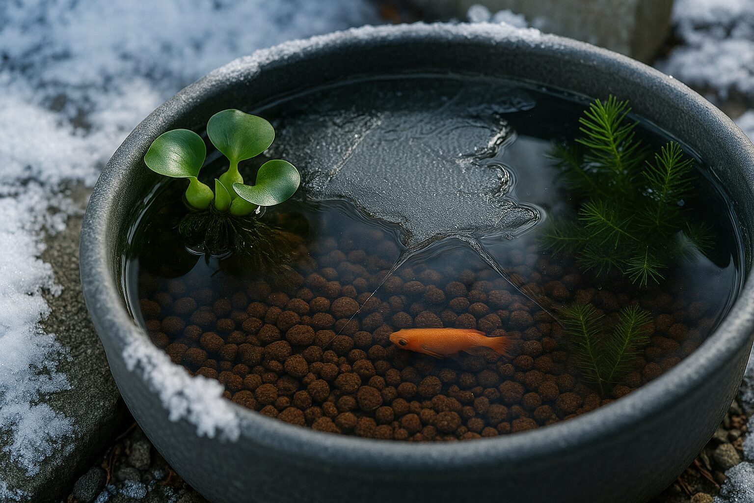 屋外飼育における最大のハードル、それが冬の「越冬(えっとう)」です。日本の冬、特に寒冷地では水温が0℃近くまで低下し、容器の水面が分厚い氷で覆われることも珍しくありません。