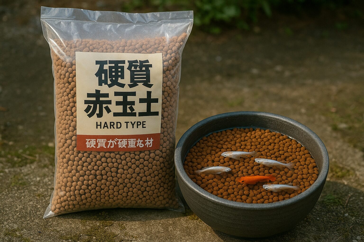 普通の園芸用赤玉土は水に入れるとすぐに崩れてしまいますが、パッケージに「硬質」や「焼き」と書かれたものは、高温で焼成処理されており、水中でも1〜2年は粒の形を保ってくれます。使用前にはザルで微塵(細かい粉)をしっかり洗い流すのがコツです。