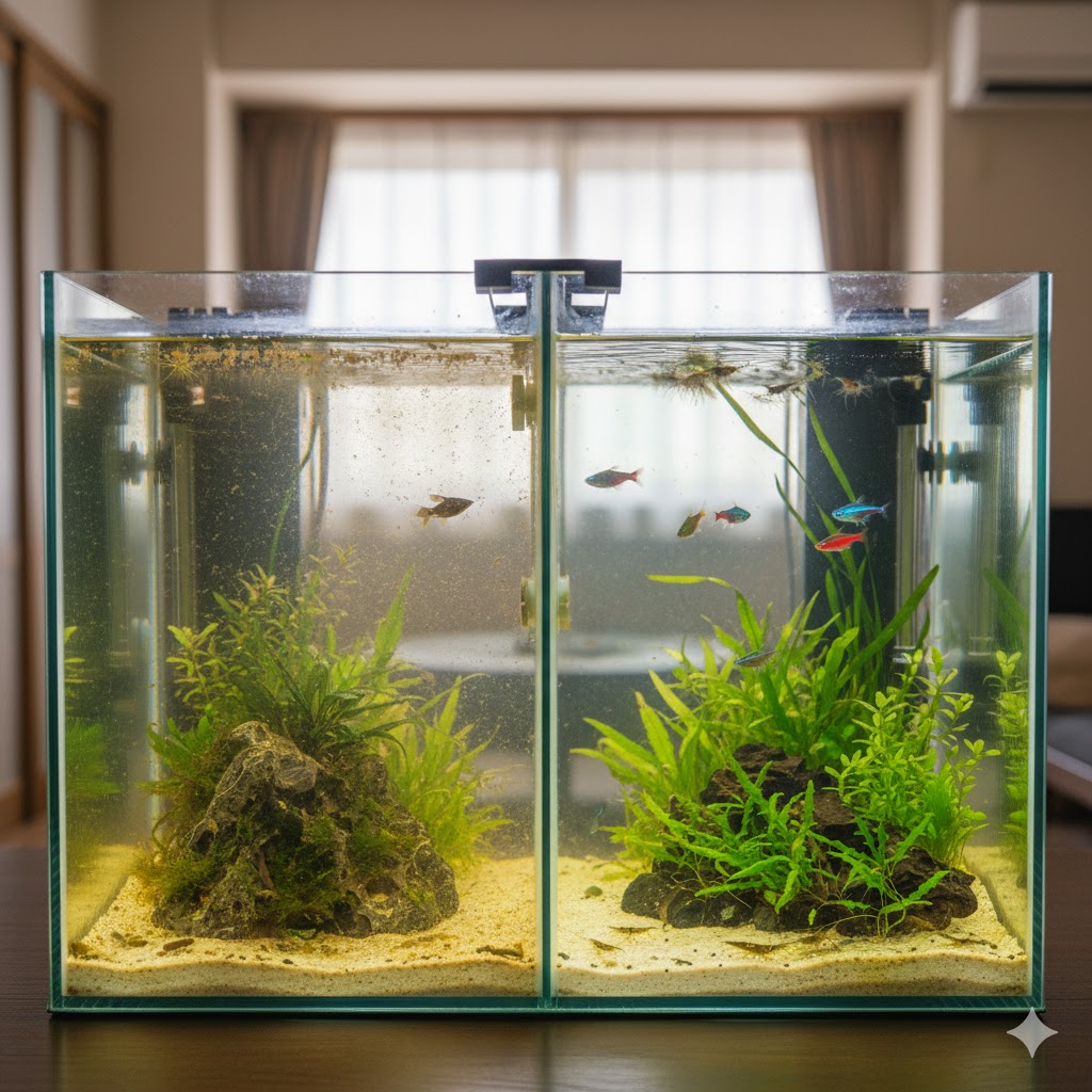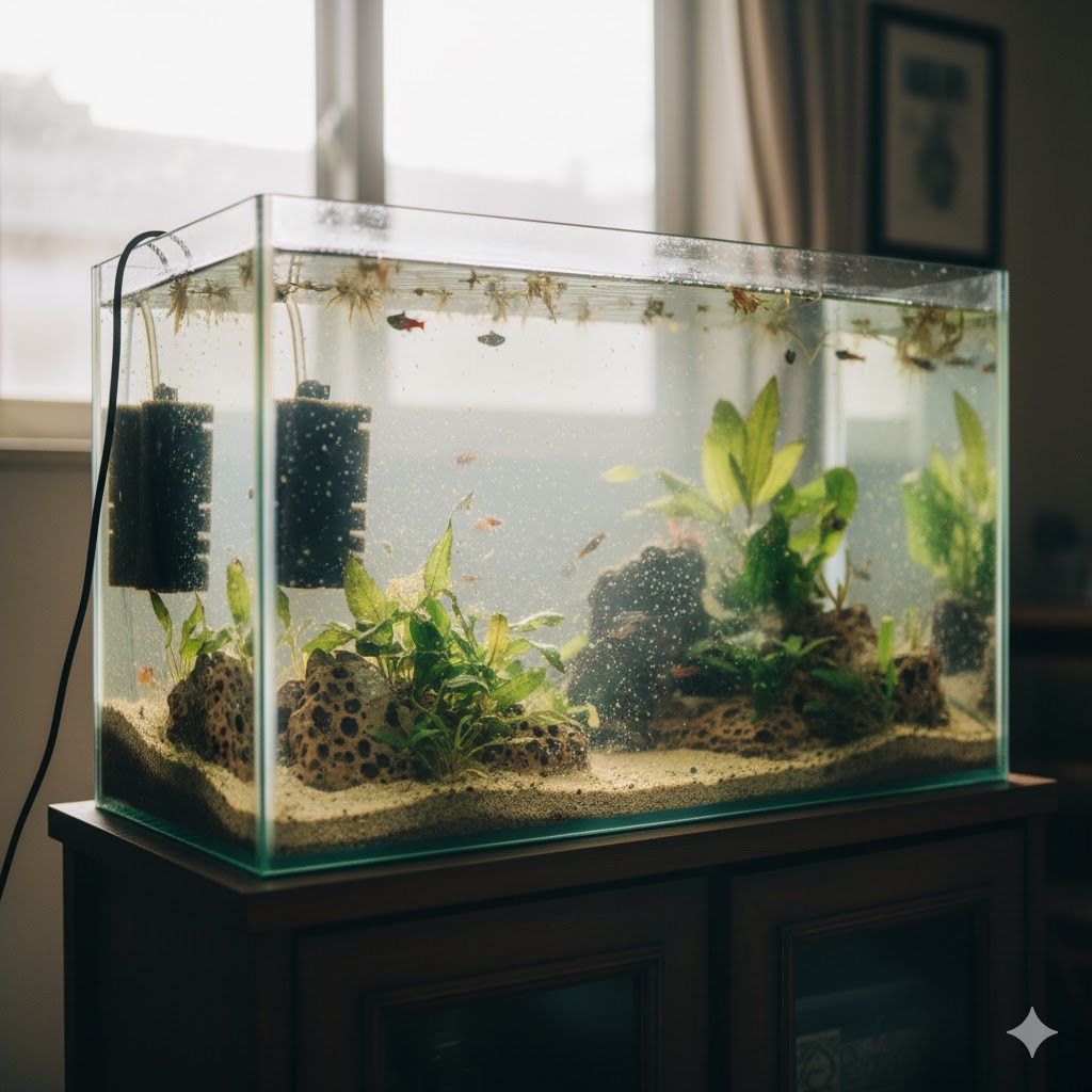 こんにちは。THE AQUA LAB、運営者の「所長」です。水槽を眺めていて、透明だったはずのガラス面や鮮やかな緑色の水草に、茶色いモヤモヤした埃のような汚れがついているのを見つけると、本当にがっかりしてしまいますよね。「せっかくレイアウトを綺麗に作ったのに…」と肩を落とす気持ち、痛いほどよく分かります。