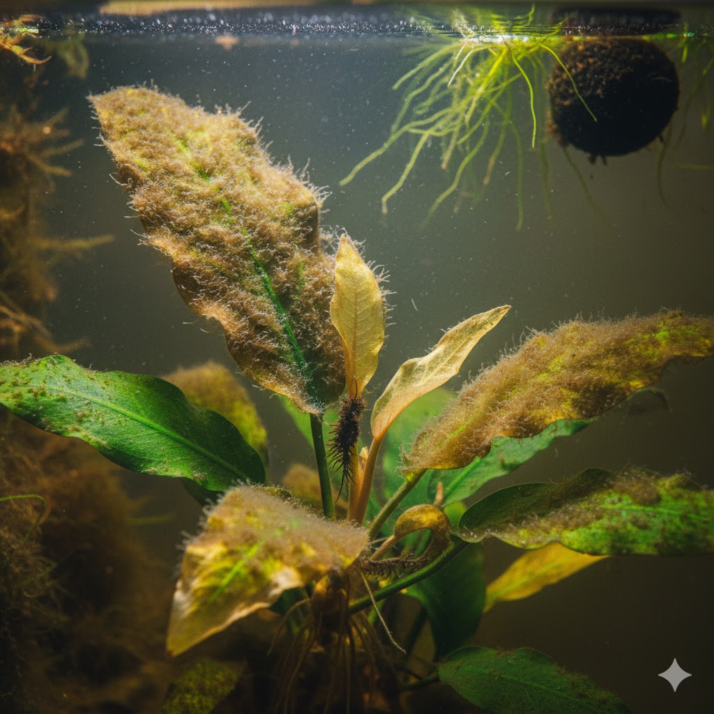 こうなると水草は成長が止まり、葉が黄色くなって溶け始め、最悪の場合は枯れてしまいます。そして、枯れた水草が水中で腐ることで水がさらに汚れ、今度はもっと厄介な「黒ヒゲゴケ」や、悪臭を放つ「藍藻(シアノバクテリア)」などを呼び寄せるという、典型的な「負のスパイラル(コケ地獄)」に陥ってしまうこともあります。水草を守るためにも、早めの対処が肝心です。