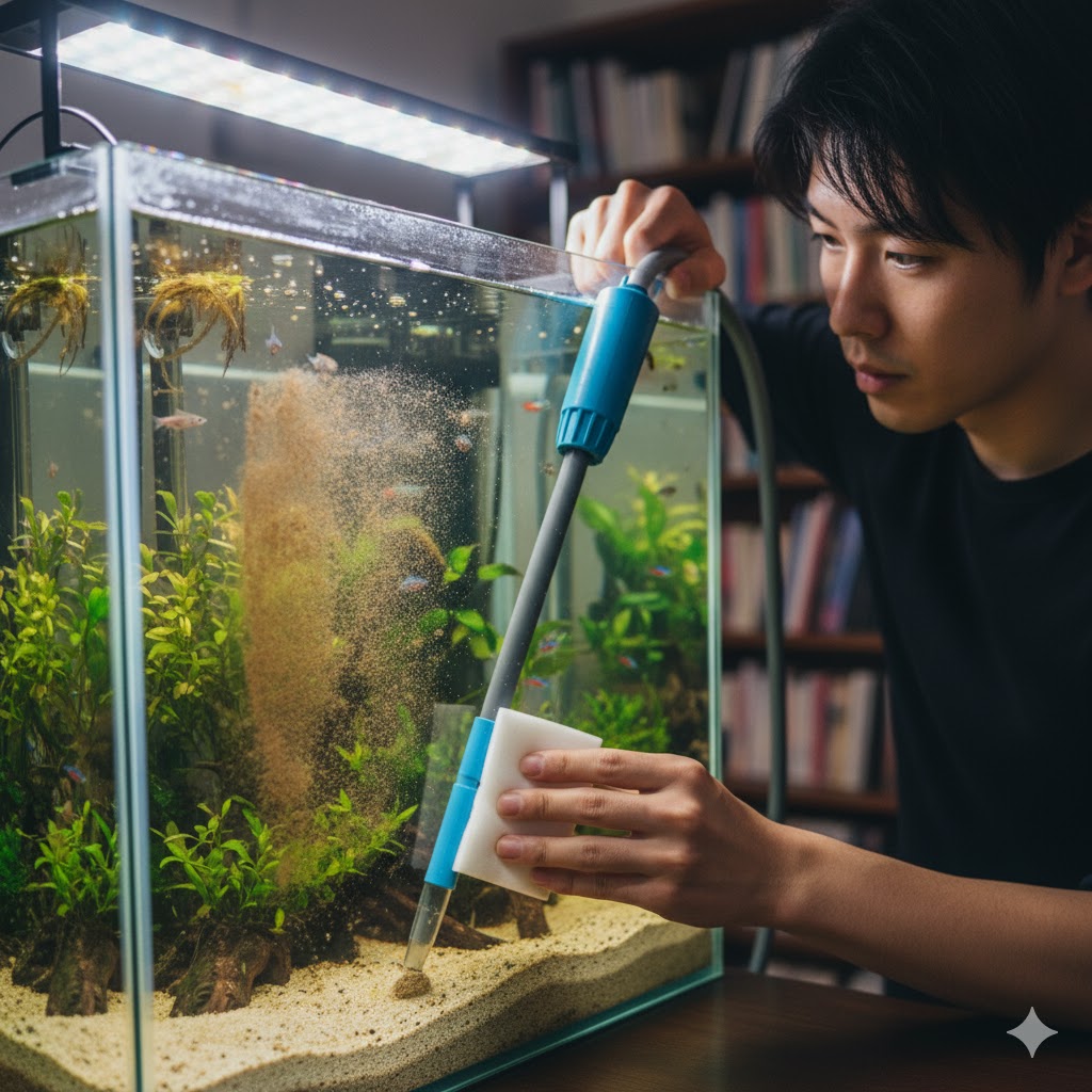 - 仕上げの吸い出し:水中に舞った汚れや底に落ちたカスを、水換え(全水量の3分の1程度)とセットで一気に吸い出します。