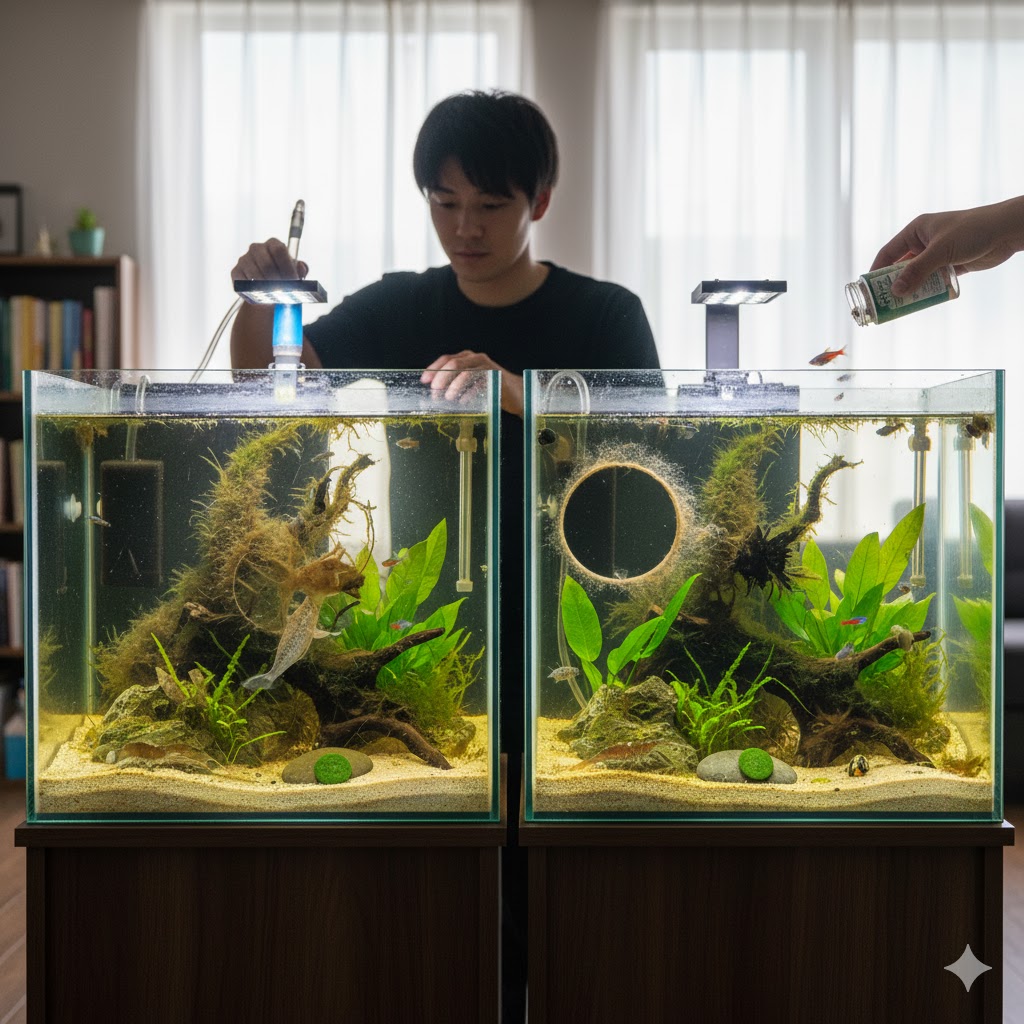 - 餌の量:「お魚が可愛くてつい…」とあげすぎていませんか?数分(2〜3分)で完全に食べきれる量が適量です。底に沈んで残った餌は、コケにとって最高の栄養源(肥料)になってしまいます。