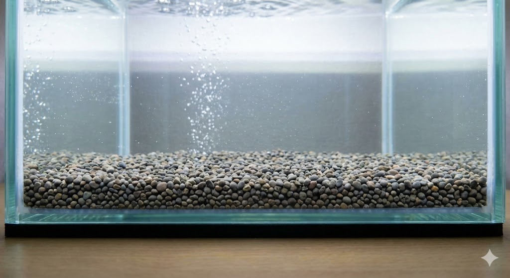 厚く砂を敷きすぎると、砂の奥底に水流が届かず酸素が行き渡らない「嫌気層」ができてしまいます。ここでは硫化水素などの有毒ガスが発生しやすく、病気の原因になります。しかし、1cmの薄敷きなら、通水性は抜群です。常に新鮮な水と酸素が砂利全体に行き渡るため、悪い菌が繁殖する余地を与えません。