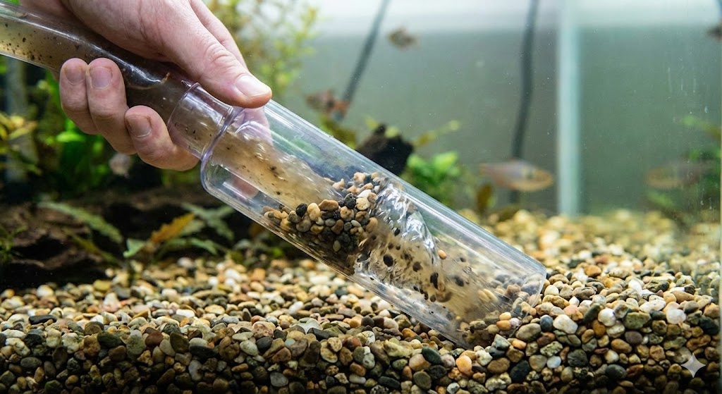 - 挿入と撹拌: パイプの先端を底砂に垂直に「ズボッ」と突き刺します。すると、透明なパイプの中で砂利が舞い上がり(流動化)、砂利同士がぶつかり合って表面の汚れが剥がれ落ちます。