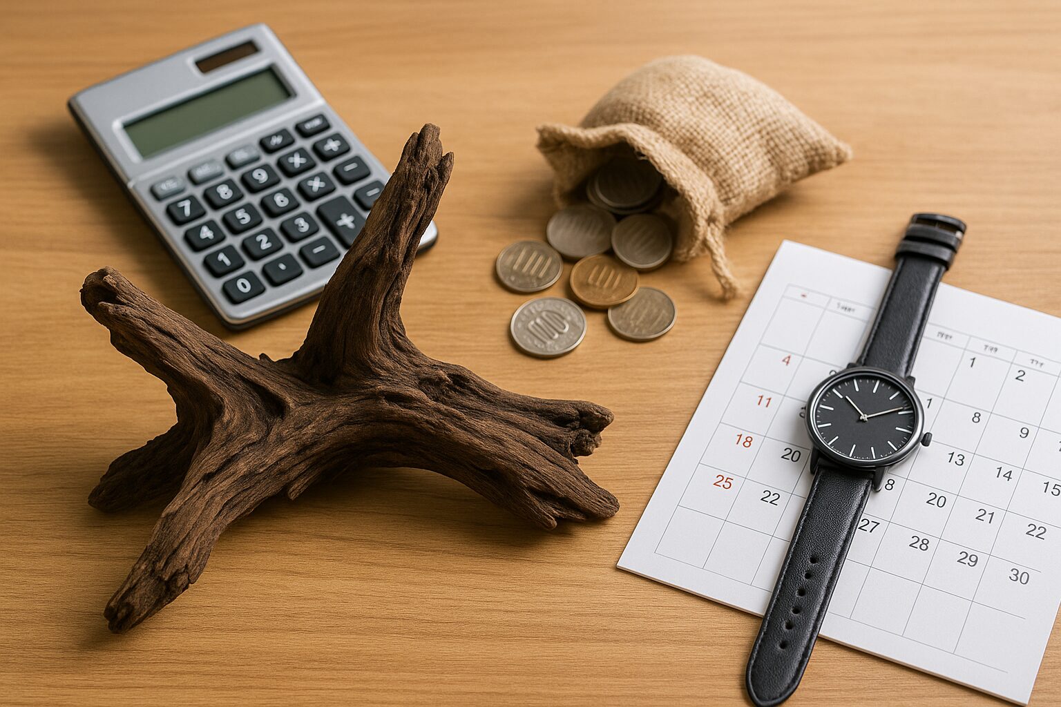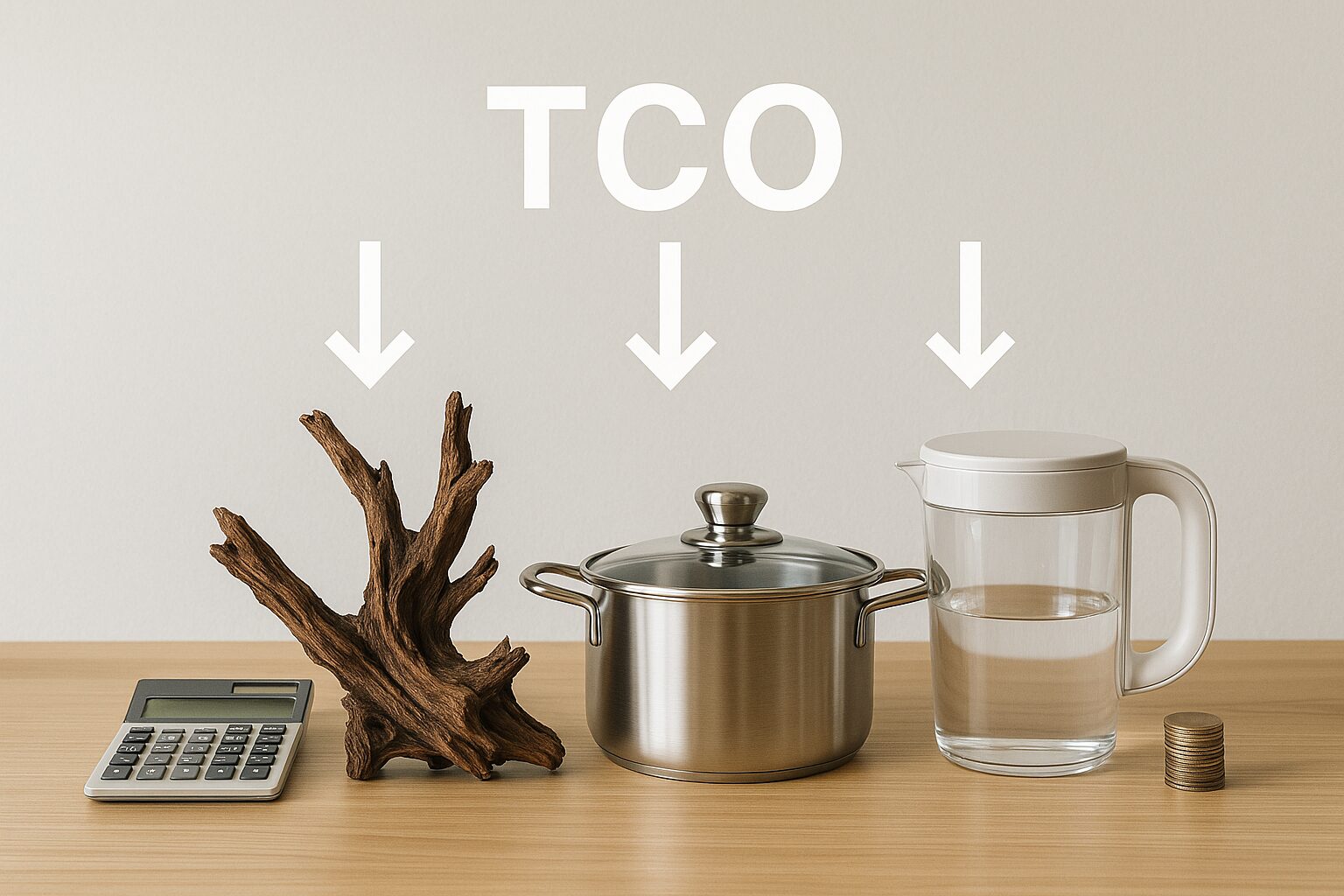 ホームセンターの安い流木は、アク抜き必須の「素材」です。購入価格(初期費用)は安いですが、TCO(総所有コスト)=(購入価格+手間+時間+光熱費+道具代)で考えると、必ずしも安くはありません。