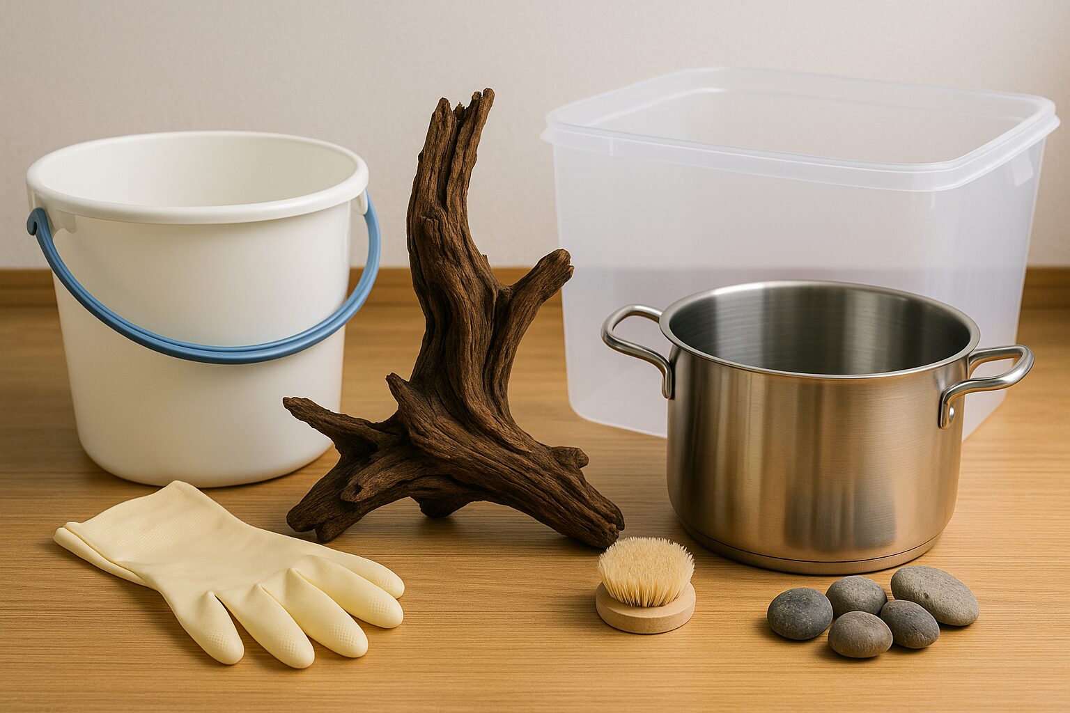 また、アク抜き処理の前段階として、表面の汚れ、コケ、腐りやすい表皮、土などをブラシやたわしでこすり洗い(ブラッシング)することも、水槽に不要なものを持ち込まないために重要です。