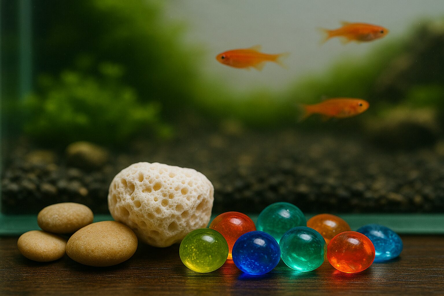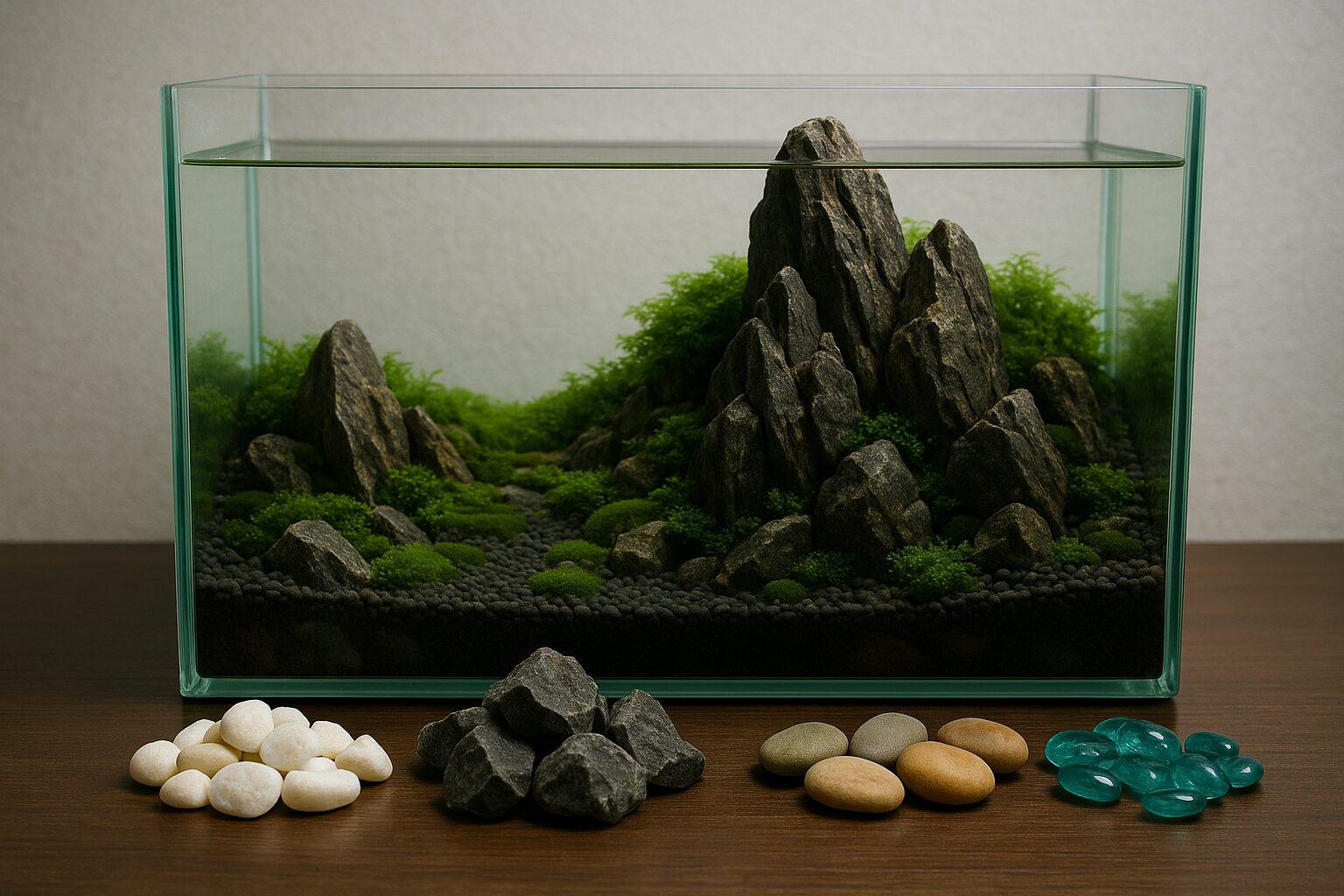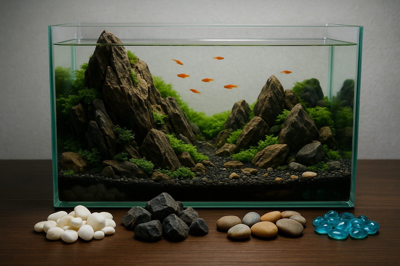 安全が確認できた透明なビー玉やおはじき、あるいはガラス製の小さな小皿や置物。これらは水質に影響を与えない(ガラスなので)ので、安全なアクセントとして使いやすいです。光が当たるとキラキラしてキレイかもしれません。