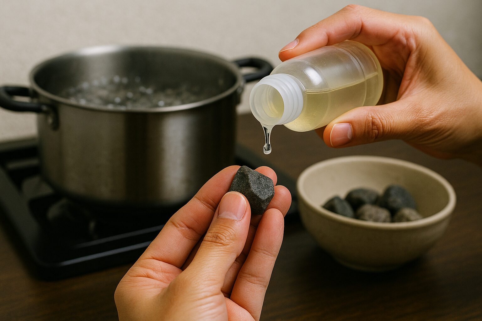 火を止めたら、鍋ごと数時間かけて「自然に冷ます」か、やけどに十分注意しながらお湯を捨て、石が完全に室温になるまで放置してください。これを必ず守ってくださいね。