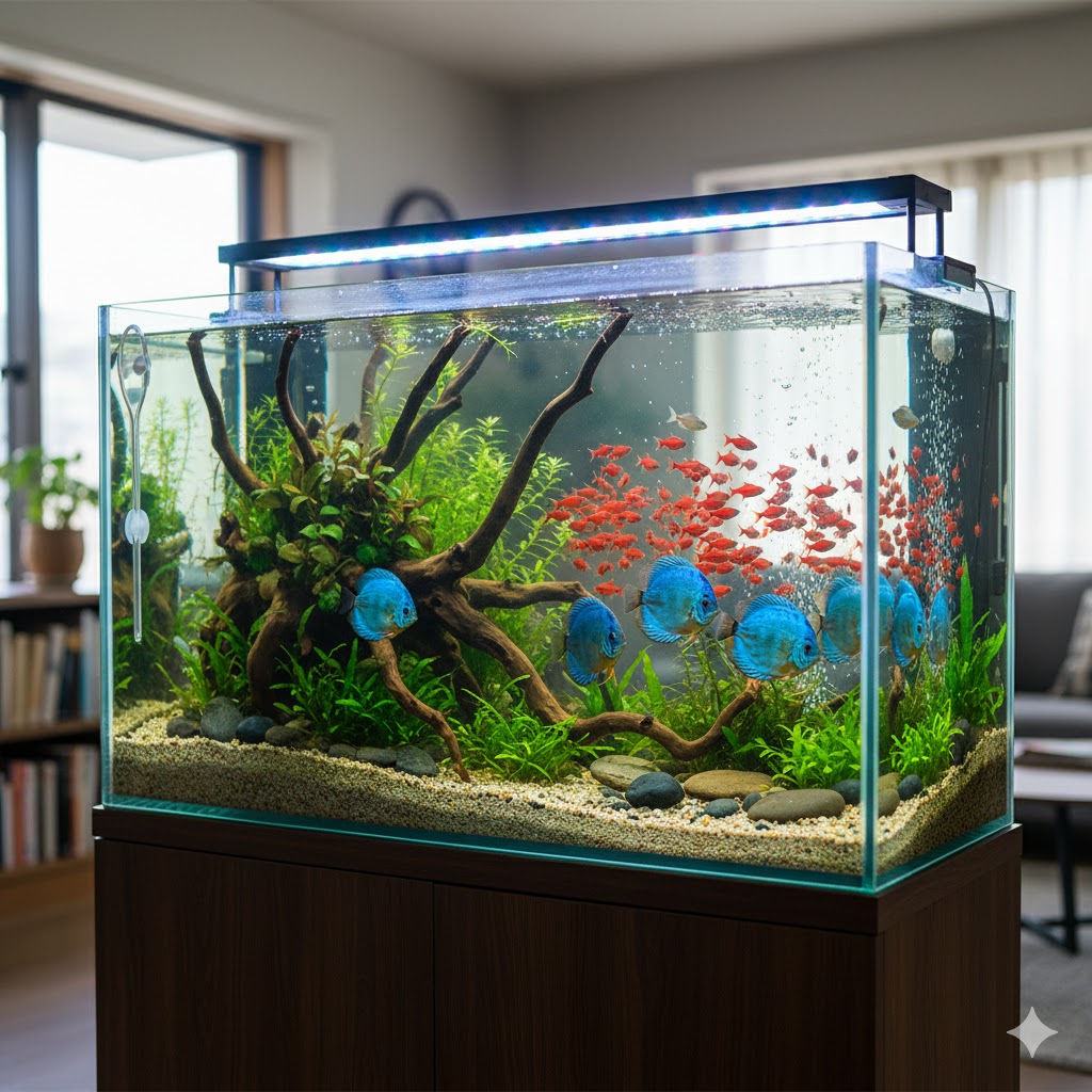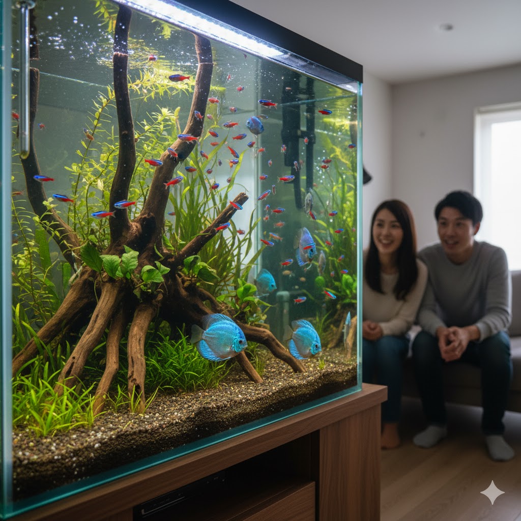 • 生体の選択肢: エンゼルフィッシュやディスカスのような体高のある中型魚をゆったり泳かせたり、カージナルテトラなどの小型魚を100匹単位で群泳させたりと、アクアリウムの楽しみ方がぐっと広がります。