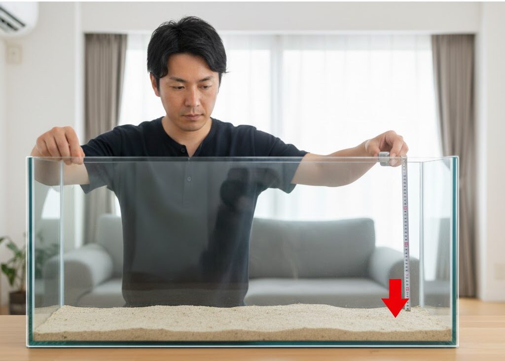 さて、水槽のスペックとしての「満水量」を把握したら、次は「管理」のために、もっと大事な数値を理解する必要があります。それが「実水量(じっすいりょう)」です。