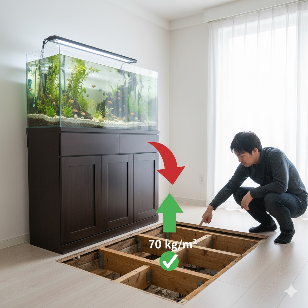 特に90cm規格水槽の総重量は、水槽台や底砂、レイアウトを含め、250kgを優に超え、300kgに達することもあります。この重量が 90 × 45cm の面積に集中した場合、一般的な住宅の床の耐荷重(目安180kg/m²)を3〜4倍超過する危険性があることを、絶対に忘れないでください。設置には床の補強や、専門家による構造の確認が必須です。